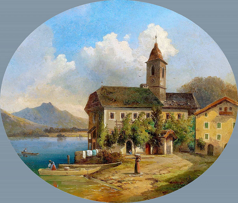 Edmund Mahlknecht – Herd of cattle with shepherdess on the lakeshore; Viehherde mit Hirtin am Seeufer