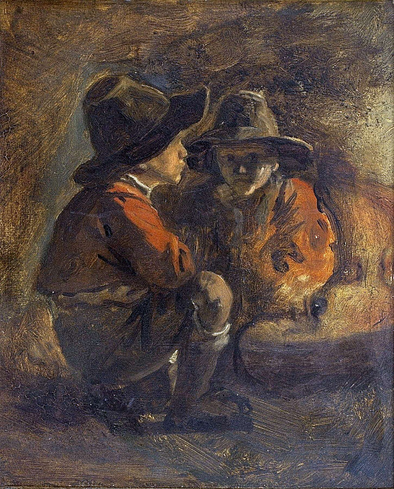 To his right, two women occupy a corner of the room. One is seated, cradling an infant in her lap, while the other sits beside her, actively engaged in spinning wool. Their clothing, though simple, displays a degree of care and ornamentation – the woman with the child wears a vibrant blue dress, while the spinner’s attire incorporates red accents. The presence of the baby reinforces themes of family and continuity.