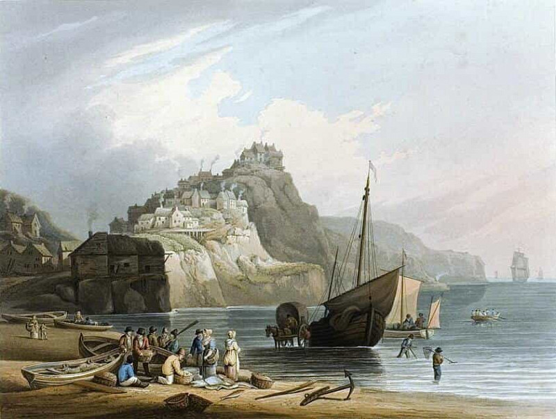 Subtly, the painting conveys themes of human resilience and adaptation. The village’s precarious position atop the promontory speaks to the challenges faced by those who live in close proximity to natures power. Simultaneously, the vibrant activity within the harbor demonstrates a thriving community that has harnessed the resources of its environment for sustenance and commerce. There is an underlying sense of industry and quiet prosperity, balanced against the imposing grandeur of the natural setting. The scene evokes a feeling of timelessness; it could represent any coastal village engaged in traditional maritime activities, suggesting a continuity of human experience across generations.