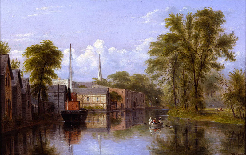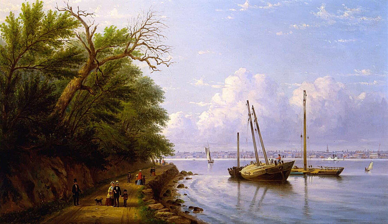 Subtly, the painting conveys themes of progress and expansion. The juxtaposition of the natural environment and the burgeoning urban landscape speaks to the transformative impact of industrialization and westward movement. The figures strolling along the path may represent a nascent class of leisure seekers, enjoying the benefits of economic growth while still maintaining ties to nature. The boat symbolizes connection and commerce, vital elements in the city’s development. There is an underlying tension between the tranquility of the natural setting and the implied energy of the distant metropolis – a visual representation of a society undergoing profound change.