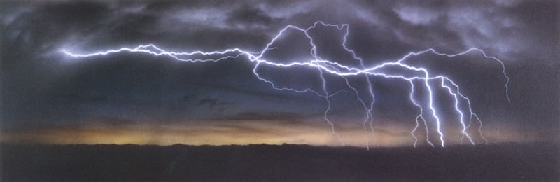 Perhaps it’s a painting of two horses running in a field with a storm cloud in the background and a bird in the foreground,.