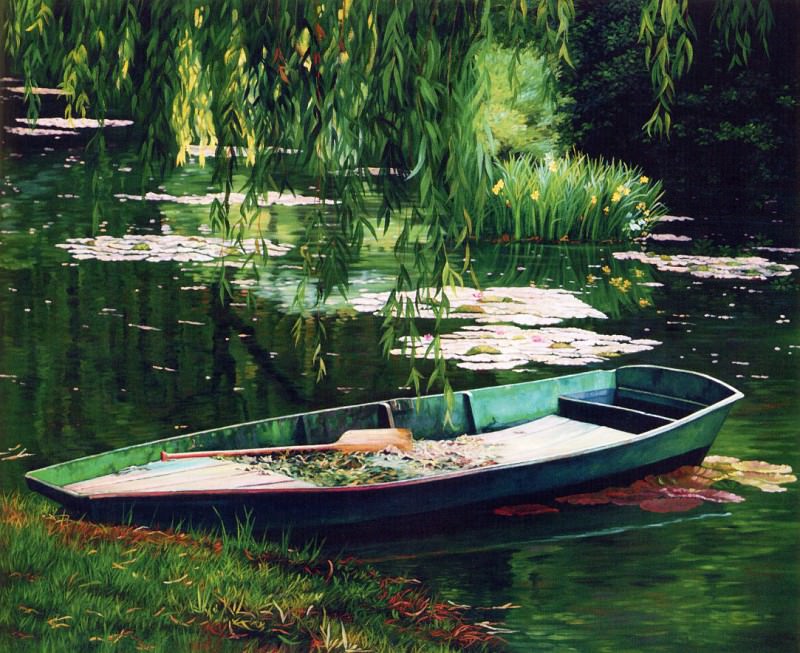 Perhaps it’s a painting of a woman in a garden with flowers in the foreground and a house in the background with trees and bushes.