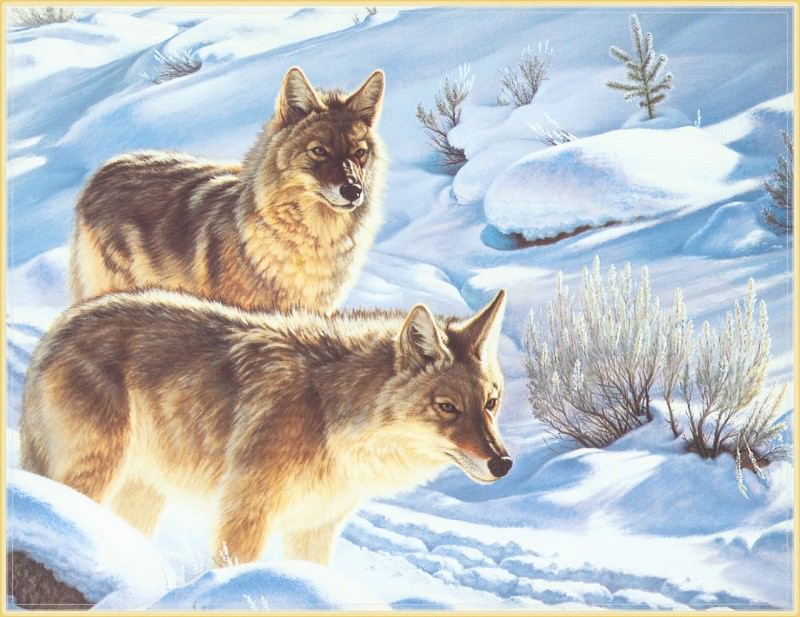 Perhaps it’s a painting of a herd of antelope running across a grass covered field with trees in the background and a blue sky with clouds.