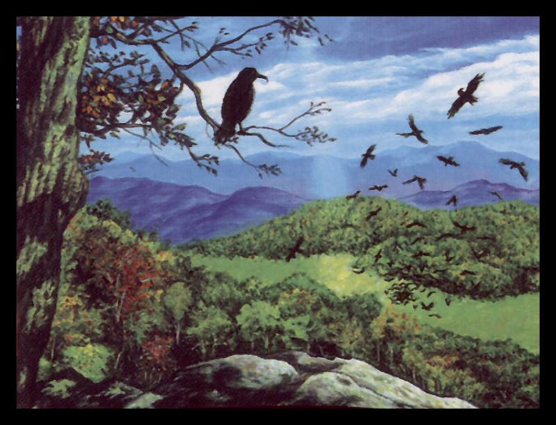 Perhaps it’s a painting of a flag on top of a building with a sky in the back ground and clouds.