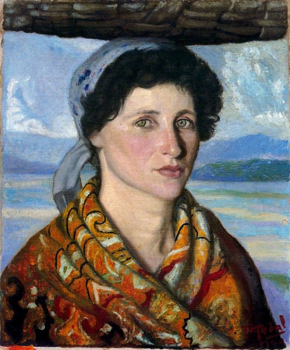 Perhaps it’s a painting of a woman and a boy sitting under an umbrella with a basket of food on a table next to a cup of coffee and a mug.