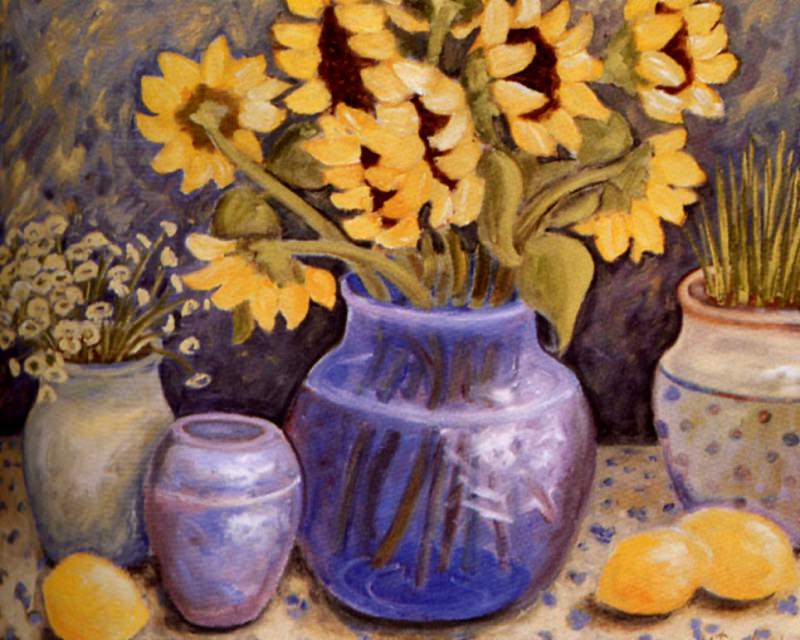 Perhaps it’s a painting of sunflowers in a blue vase next to a blue and white plate with cookies on it and.
