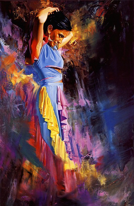 Perhaps it’s a painting of a native american woman standing in a forest holding a basket and looking off into the distance with trees and grass in the foreground.