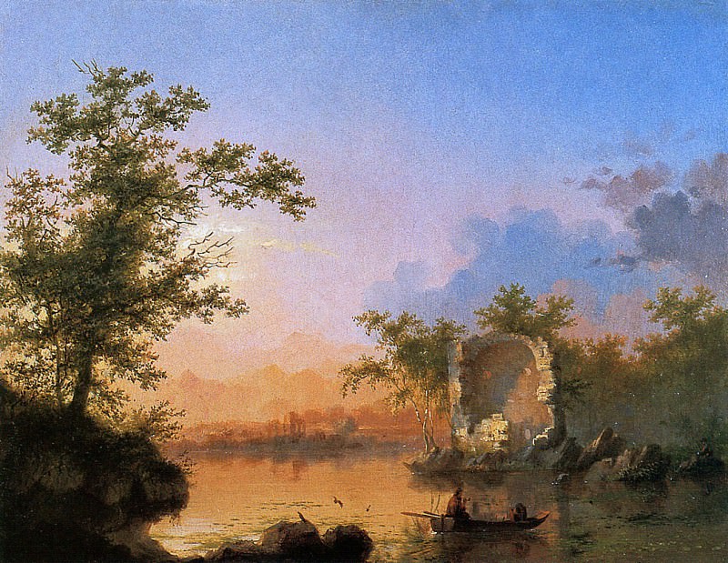 Subtly, the presence of human figures within this grand landscape hints at themes of exploration, journey, or perhaps even humanity’s relationship with nature. The scale disparity between humans and environment implies humility and insignificance in the face of overwhelming forces. The overall mood is one of quiet contemplation and awe-inspiring grandeur; a romanticized vision of wilderness that evokes feelings of solitude and reverence.