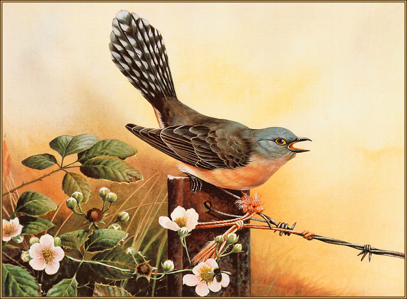 Perhaps it’s a painting of two colorful birds perched on a branch of a tree with red, yellow, blue, and green leaves in front of a beige background.