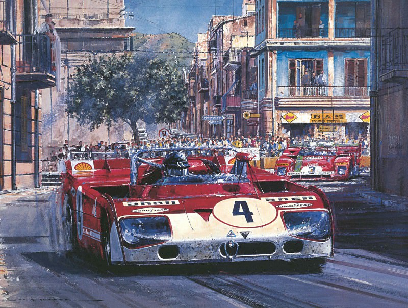 Perhaps it’s a painting of two racing cars driving down a race track with a crowd of people watching from the side of the track and onlookers.