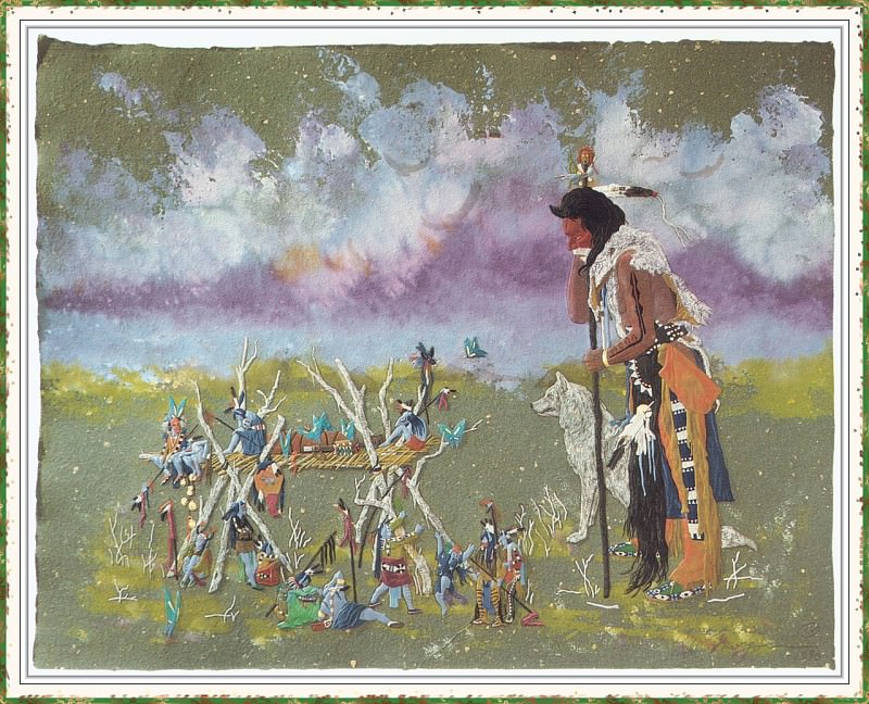 Perhaps it’s a painting of a man riding a horse next to a man.
