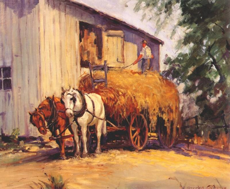 Perhaps it’s a painting of a man and a woman standing on a riverbank with trees in the foreground and a mountain range in the distance in the background.