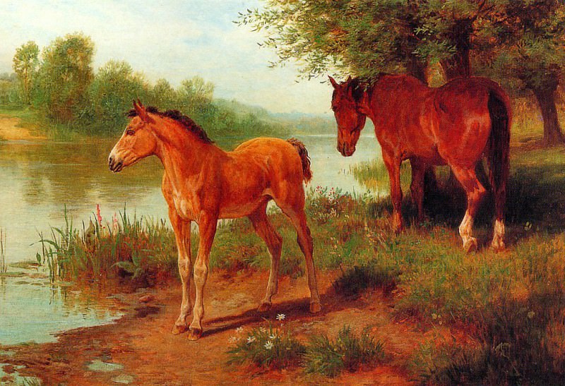 Perhaps it’s a painting of a man sitting on top of a hill next to two dogs and a man laying on the ground with a dog next to him.