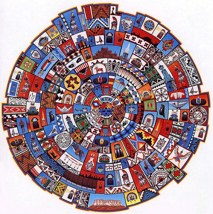 The central area features a stylized motif resembling a target or a simplified representation of indigenous textiles, employing bold red and black tones. This focal point seems to anchor the surrounding panels, suggesting a core identity or origin from which the various elements radiate outward.