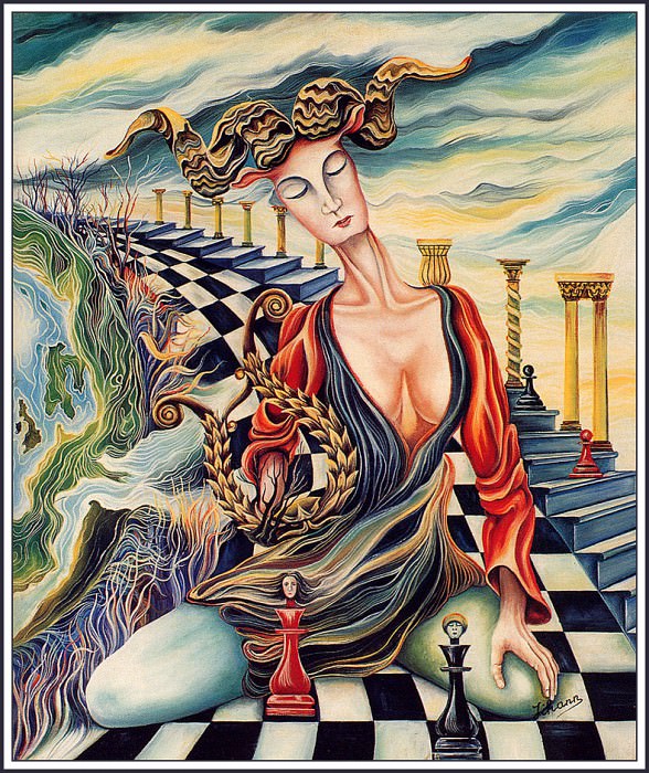 The closed room setting further reinforces this sense of isolation and intimacy, suggesting that the depicted event is taking place within a private sphere, away from external observation. A partially visible door on the right side of the composition offers a subtle suggestion of an outside world, yet it remains inaccessible to those engaged in the game. Overall, the work conveys a complex interplay of social dynamics, psychological tension, and stylized aesthetics.