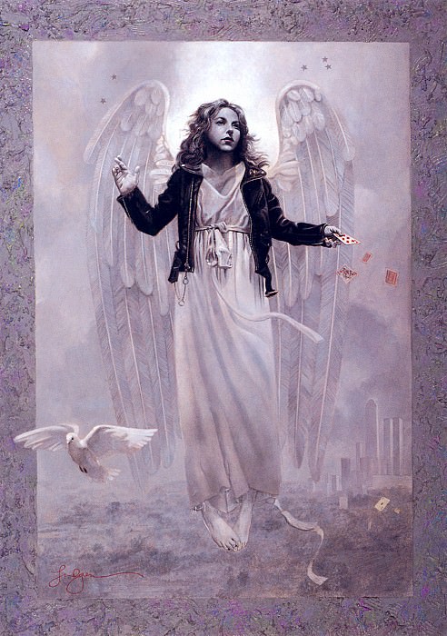 Perhaps it’s a painting of a group of people walking down a street in the rain with umbrellas in the foreground and a clock tower in the background.