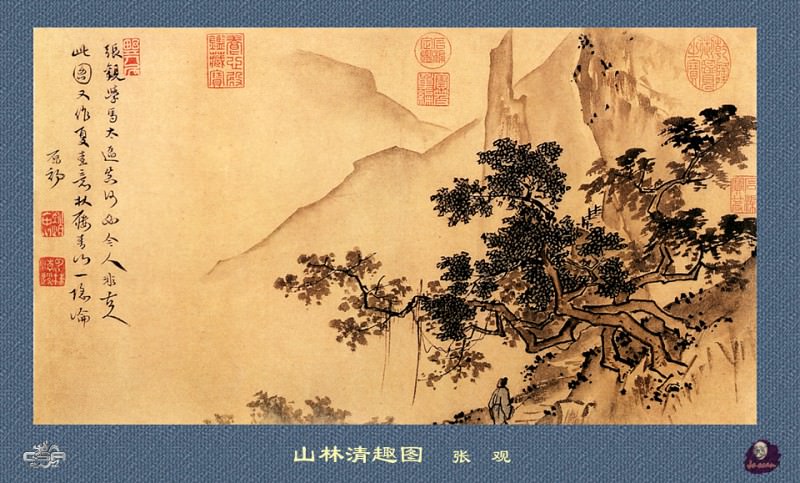 To the right, a dense cluster of pine trees occupies much of the pictorial space. These trees are meticulously detailed, their branches and needles individually articulated to convey texture and volume. A small structure, possibly a pavilion or dwelling, is nestled amongst the foliage, partially obscured by the density of the vegetation. The artist employed varied brushwork here; some areas are heavily inked, creating dark shadows, while others are lighter, suggesting sunlight filtering through the trees.