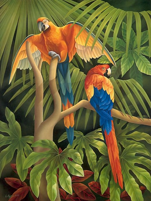 Perhaps it’s a painting of a flamingo on a branch with a flower in the foreground and a tree in the background with leaves.