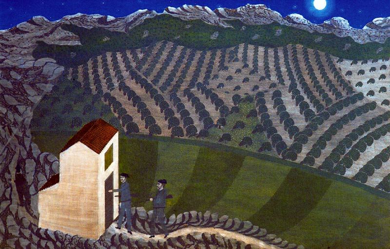 Perhaps it’s a painting of a group of people walking down a path with horses and horses on the other side of the path, with hills in the background.