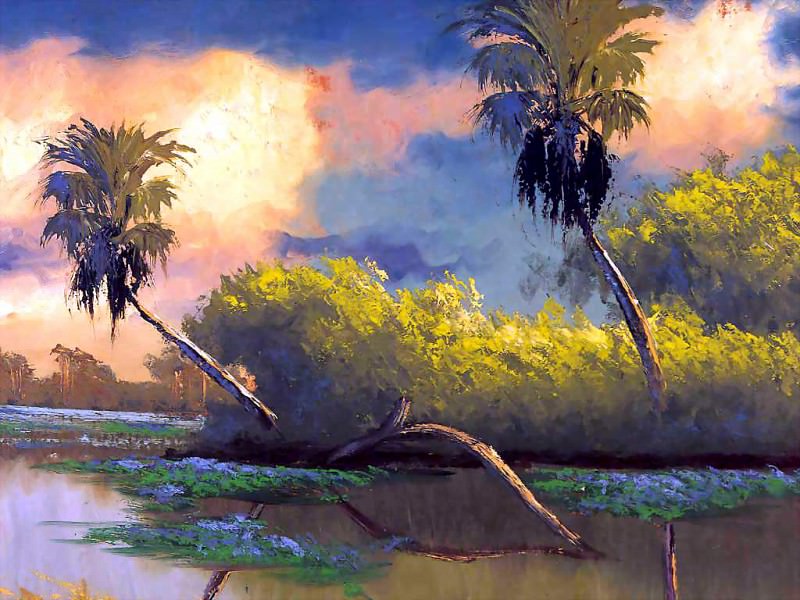 Perhaps it’s a painting of a swampy area with trees and a body of water in the foreground and a few birds flying in the sky in the background.