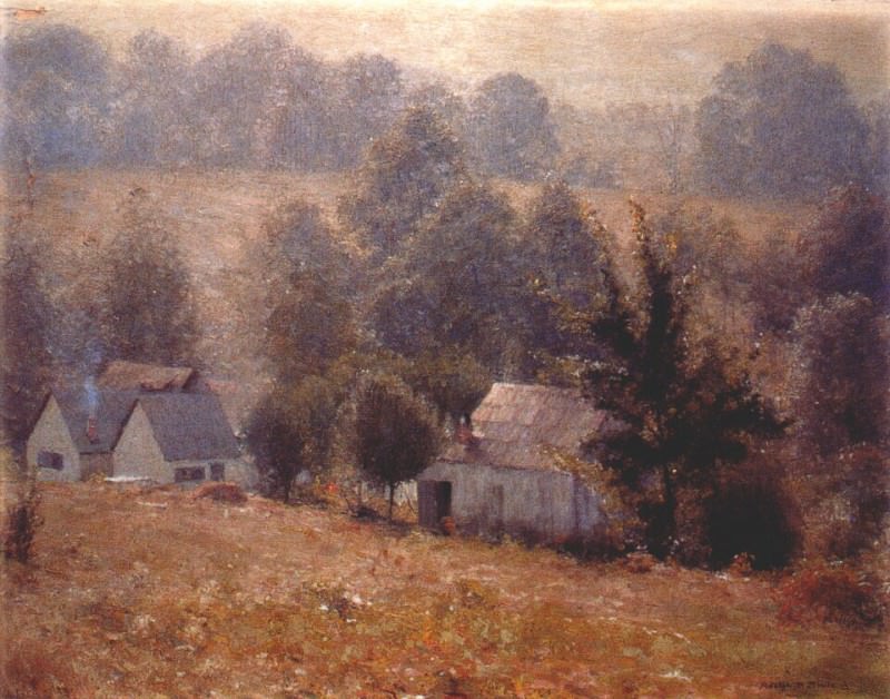 Perhaps it’s a painting of a rural scene with a church in the distance and a field with trees in the foreground and houses on the other side of the picture.
