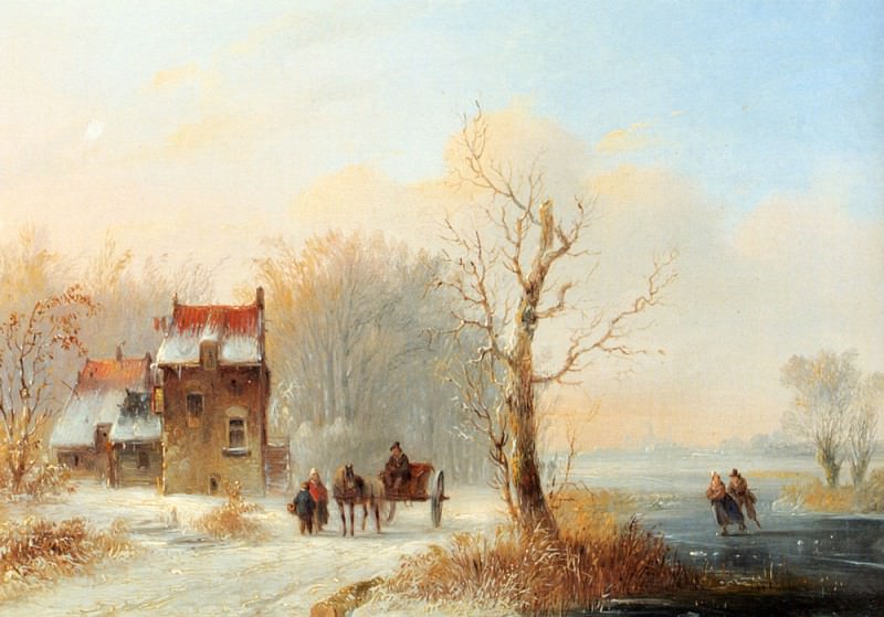 Perhaps it’s a painting of a winter scene with people walking in the snow and a horse and buggy in the foreground and a dog.