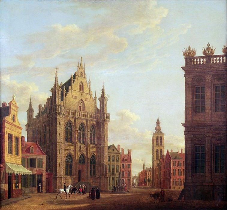 Subtly, the painting conveys an impression of prosperity and civic pride. The well-maintained architecture and orderly layout suggest a stable and thriving community. However, there is also a melancholic undertone; the muted colors and quiet atmosphere hint at a sense of nostalgia or perhaps a reflection on the passage of time. The solitary figure fishing in the canal could be interpreted as a symbol of contemplation or a yearning for simpler times amidst the backdrop of urban life. Overall, the work offers a glimpse into a specific place and moment, inviting viewers to consider its history, character, and the lives of those who inhabit it.
